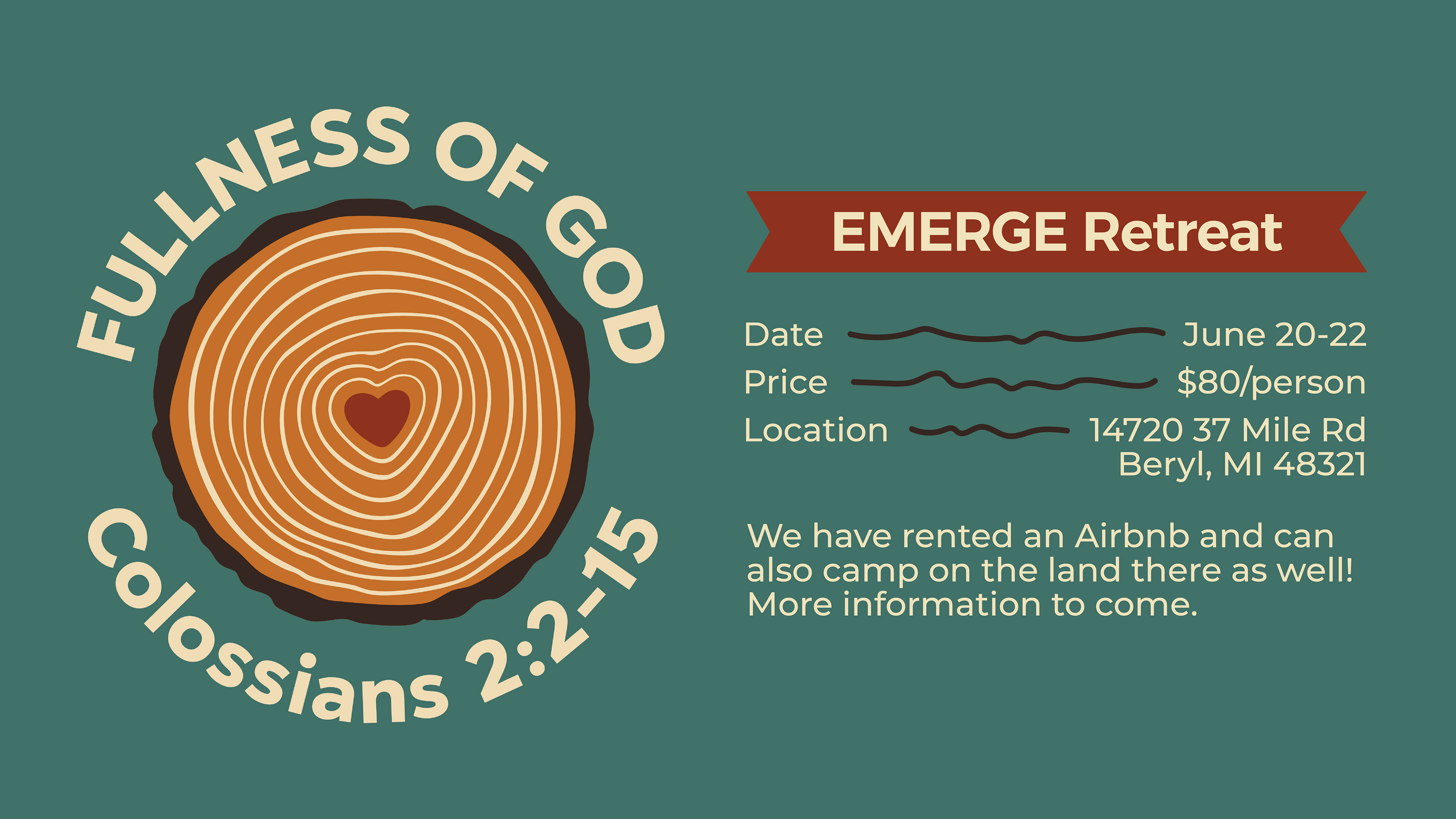 EMERGE (young adult group) of City On A Hill Church (COAH) needed graphics to promote their retreat. They needed a logo for the retreat as well as Facebook and IT slide graphics. I drew the wood slice logo illustration with the Procreate app and used Adobe Illustrator for the text and layout.